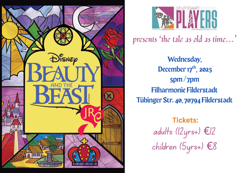 This Winter, Stuttgart Players showcases the 'tale as old as time,''Beauty and the Beast Jr.!" A group of 20 students, together with their director, Mrs. Elaine Sepani, specialize in producing iconic musical theater plays for families and young children. As part of a Performing Arts program, the children exhibit their theatrical performance and design skills in drama, singing, set/props, lighting, and costumes. It is with joy that they can present their final projects in the distinguished Filharmonie Filderstadt.